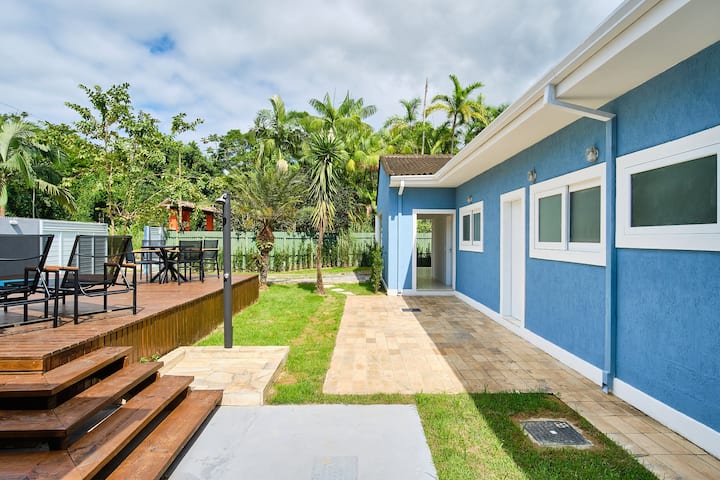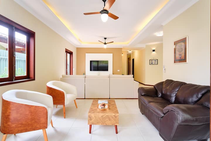 Groot huis met 3 slaapkamers, alle suites, met airconditioning en plafondventilator. Twee slaapkamers hebben een queensize tweepersoonsbed en eenpersoonsbed, en het grotere slaapkamer queensize tweepersoonsbed en eenpersoonsbed met nog een eenpersoonsbed. Om de sociale ruimte te bedienen, hebben we nog een badkamer van het badkamertype. Grote kamer met twee kamers, één met een bekledingsset, een smart-tv met Sky en de andere kamer met fauteuils en bank, beide met plafondventilatoren. Cup met tafel met 8 stoelen. De keuken is compleet met alle spullen die je nodig hebt, zoals een koelkast, een fornuis, een fornuis, een magnetron, een koffiezetapparaat, een broodrooster, een broodrooster, een blender, een elektrische friteuse en ander keukengerei dat je nodig hebt, in de keuken staat een andere tafel met 4 stoelen. Wasruimte met tank, strijkplank en strijkplank. Wasmachine.