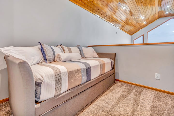 Loft voor de kinderen: voor gezinnen die met kinderen reizen, is de loft bij Eagle's Landing de perfecte ruimte voor de kinderen om rond te hangen, te ontspannen en comfortabel te slapen. Dit veelzijdige gebied beschikt over twee grote bedden, een ligbed met een uitschuifbed en een extra eenpersoonsbed, met voldoende slaapplaatsen voor de jongere. Het is de ideale ruimte voor hen om te genieten van hun eigen gebied terwijl ze nog steeds dicht bij de familie zijn. De loft heeft ook een tv voor entertainment, zodat de kinderen hun favoriete programma's of films kunnen kijken, en een eettafel waar ze kunnen genieten van maaltijden of spelletjes kunnen spelen. Deze gezellige, functionele ruimte is zeker een hit bij je kleintjes!