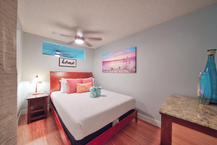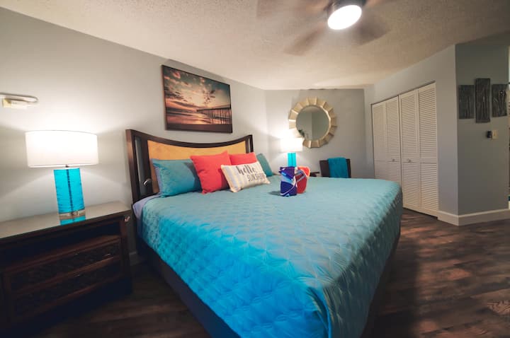 Geniet van een volledig uitgeruste keuken, kingsize bed, 2 eenpersoonsbedden, queen in bonuskamer, queen slaapbank, Pack 'n Play en kinderbedje.