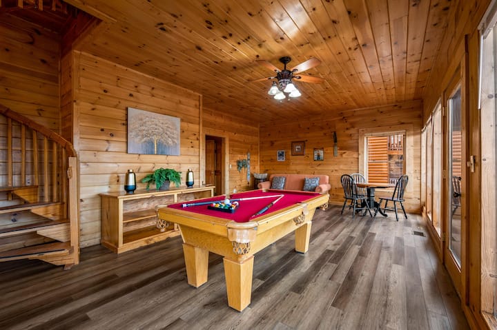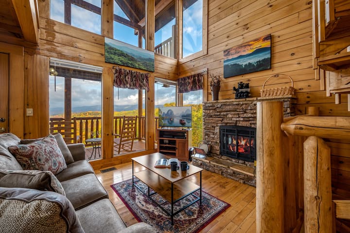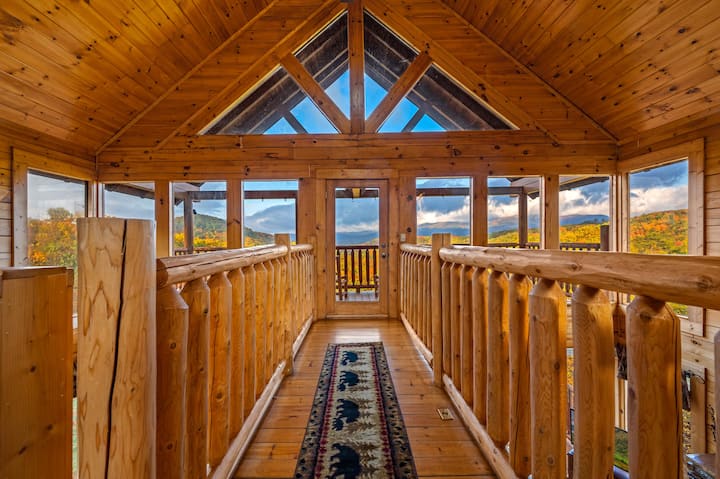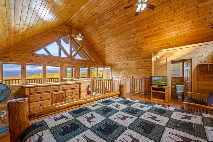 Mountain Majesty beschikt over een hut met 3 slaapkamers en 3 badkamers, perfect voor groepen of grote gezinnen. Het biedt comfortabel plaats aan 6-10 personen. Bij binnenkomst word je begroet met hoge gewelfde plafonds, grote ramen en een rustig bosrijk uitzicht.