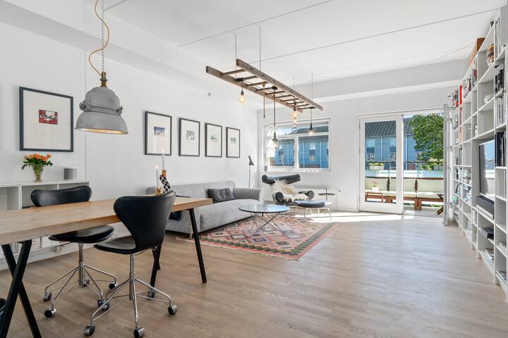 Den store lejlighed i NYC stil er på 200 kvadratmeter er i ét plan . Lejligheden er centralt placeret i det atraktive København. Lejligheden byder på to solrige altaner som der er direkte udgang til via store glas døre fra køkkenalrum og opholdsstuen. Yderliger er der en stor sydvendt tagterrasse med gode grill faciliteter til minimum 20 mennesker. Fra tagterassen er der en dragende udsigt ud over byen. Lejligheden er nyling istandsat og mangler intet af moderne bekvæmmeligheder. Lejligheden indeholder et kæmpe leverum med stor spisefadeling til minimum 12 personer og et moderne åbent køkken - en indretning som er de perfekte rammer om en hyggelig middag. I det store leverum er der en hyggelig og tilbagetrukket afdeling med sofa, TV og en kontorplads. Hele lejligheden fremstår ny og luftig. Altanerne og glaspartier vender mod syd og vest og gør lejligheden solrig og lys. Fra alle rum er der en fri og god udsigt over kvarterets mange forskellige bygninger, gavlmalerier, grønne areal og træer. Ud over de to store separate soveværelser er der et entre areal. Herfra er adgang til et flise badeværelse med blandt andet brusenische og en vaskesøjle. Der er elevator lige til hoveddøren og lejligheden er velgenet til kørestolsbruger kva de åbne arealer og brede døre. Kommer du i bil kan den parkeres i det aflåste parkeringshus (Husk at informer os hvis du vil bruge parkeringshuset, så vi kan sørge for en gæsteparkeringstilladelse). På gaden er der iøvrigt gratis parkering. Bygningen tilbyder blandt andet to store gårdanlæg med grøn beplantning, grill faciliteter, og store legepladser. De to legepladser er meget vellidt af ejendommens børn og forældre.