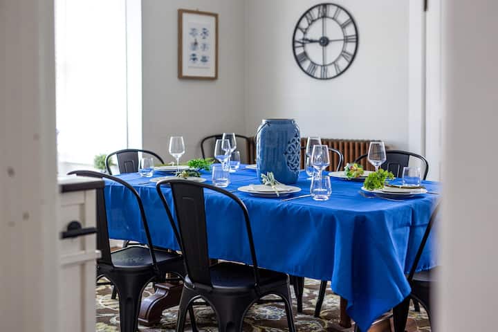 Dineer in de charmante woonruimte van de keuken met zitplaatsen voor vier personen terwijl je door het grote raam geniet van het landelijke landschap. Of verzamel de groep in de ruime eetkamer aan de boerentafel voor acht personen. Geniet van de grillige kous en rendierdecoratie en natuurlijk licht door het raam.
