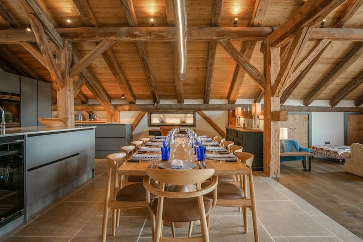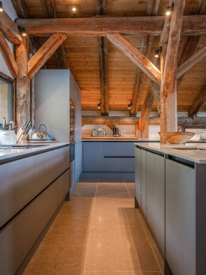In het hart van het chalet is een prachtige open keuken, eetkamer en woonkamer van 120 m ². Uitgestrekte ramen omlijsten een adembenemend panoramisch uitzicht over Morzine en de omliggende toppen, waardoor een pittoresk achtergrond voor je verblijf ontstaat. Een stijlvolle dubbelzijdige houtkachel verbetert de gezellige sfeer, waardoor het de perfecte ruimte is voor familie en vrienden om samen te komen en verhalen te delen na een dag vol avontuur. De volledig uitgeruste keuken is de droom van een chef-kok, compleet met moderne apparatuur en veel ruimte om stevige Alpenmaaltijden te bereiden en te genieten.
