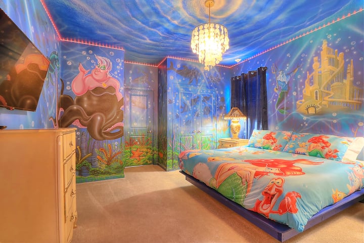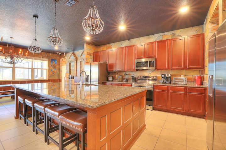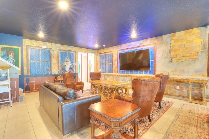 *Harry Potter 's grote hal thema open woonkamer met dubbele (2) 85" Smart 4K-tv' s, aangepaste lange eettafel en kookeiland met zitplaatsen voor meer dan 16 personen.