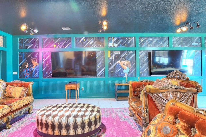 *Central Perk coffeeshop thema & Harry Potter-thema open woonkamer met 4x 85" Smart 4K-tv's, podium, pubtafels, tafels en keukeneiland met zitgelegenheid voor meer dan 50 personen. Laat je stinkende kattenzangwedstrijd doorgaan met het podium, compleet met Bluetooth karaoke, toetsenbord en akoestische gitaar. (tv-huis)