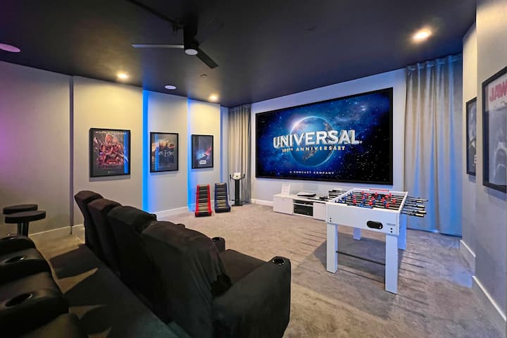 Reusachtig 150-inch scherm met opties om films te streamen vanaf je favoriete bron (Netflix, Prime Video, Hulu, Disney, enz.) op Apple TV, of kijk naar je favoriete Blu-ray of dvd's die je meeneemt of speel games op de nieuwste Playstation 5 – leun achterover en geniet van een film in een grote ligstoel met ongelooflijk 6-speaker surround sound – Klassieke Pac-man en Simpsons arcade consoles.