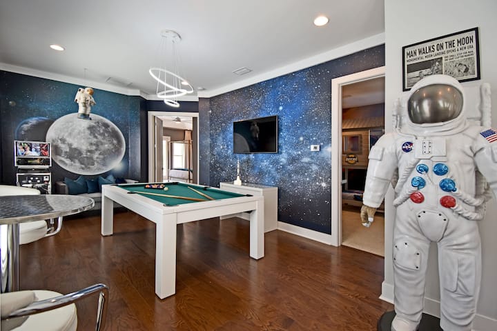 Stijlvol design, luxe comfort en eindeloos entertainment, met een uitgestrekt zwembaddek van 2200 ft2 op het zuidwesten en een buitenkeuken, geen achterburen op een prachtig bos in het prachtige 3,5 vierkante mijl Reunion Resort. Je hebt je eigen zwembad met overflow spa, filmkamer, biljart - speelkamer, 4 themakamers: BUITENRUIMTE, MARVEL-SUPERHELDEN met een BUISGLIJBAAN, BEVROREN II, HARRY Potter-kast, PS5, binnen enkele minuten naar Disney.