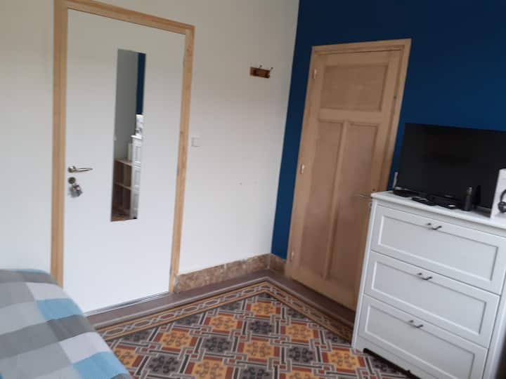 Slaapkamer met eigen badkamer en toilet.