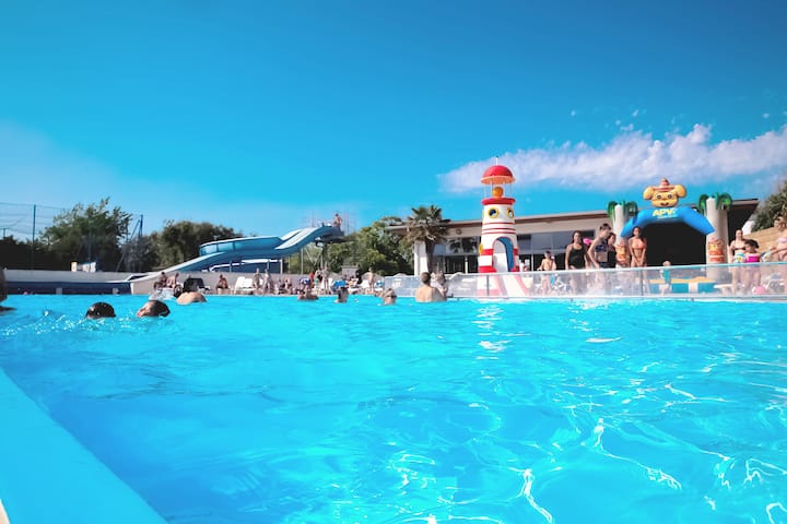 • Waterpark: het hele seizoen geopend van 10.00 tot 13.00 uur en van 14.00 tot 20.00 uur (afhankelijk van de weersomstandigheden). Binnenzwembad: verwarmd / buitenzwembad: niet verwarmd