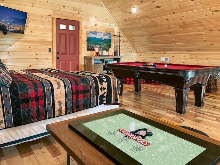 "Deze hut was geweldig! De locatie was net ver genoeg buiten het drukke gebied om afgelegen te voelen, maar toch dicht genoeg bij alles. We hielden van de speeltafel boven en genoten daarvan tijdens onze vrije tijd! Het bubbelbad was geweldig en de bedden waren comfortabel!" Stefanie, juli 2025