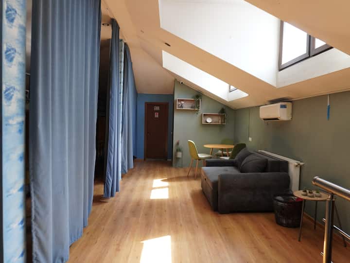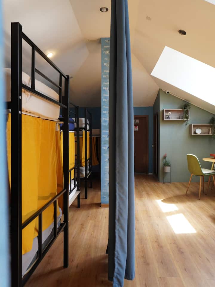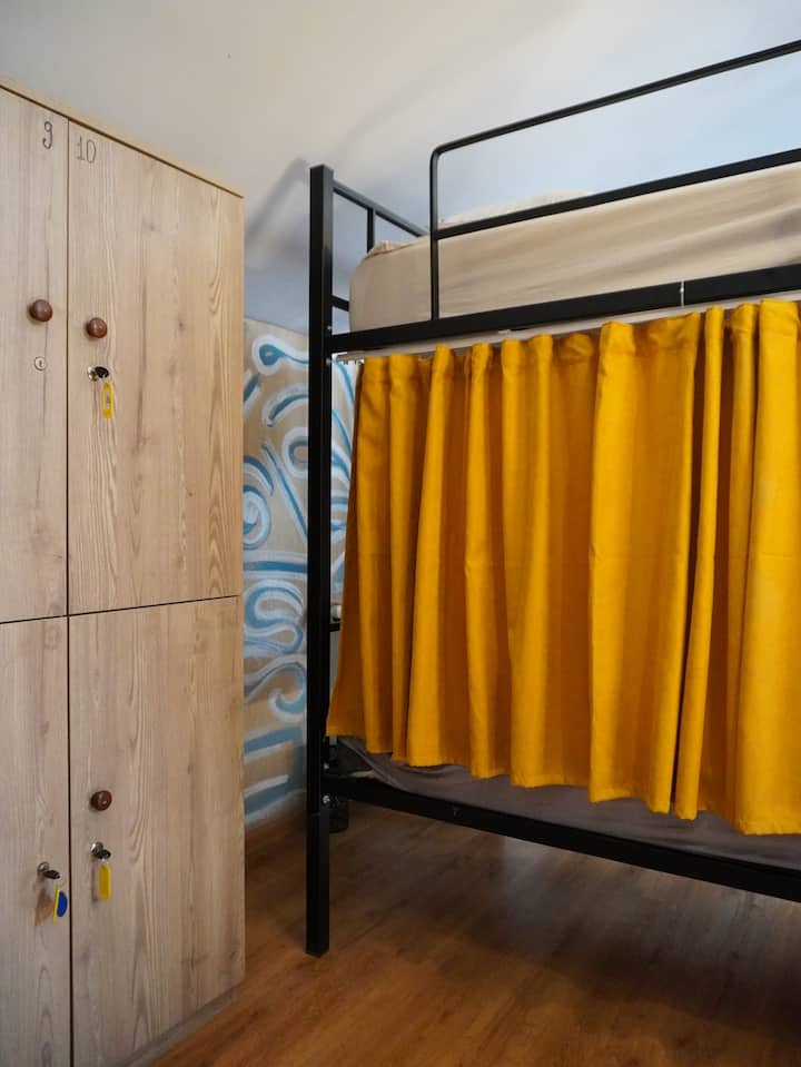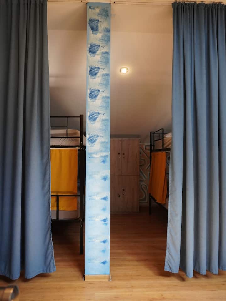 Gezellig stapelbed met privacygordijnen en snelle wifi