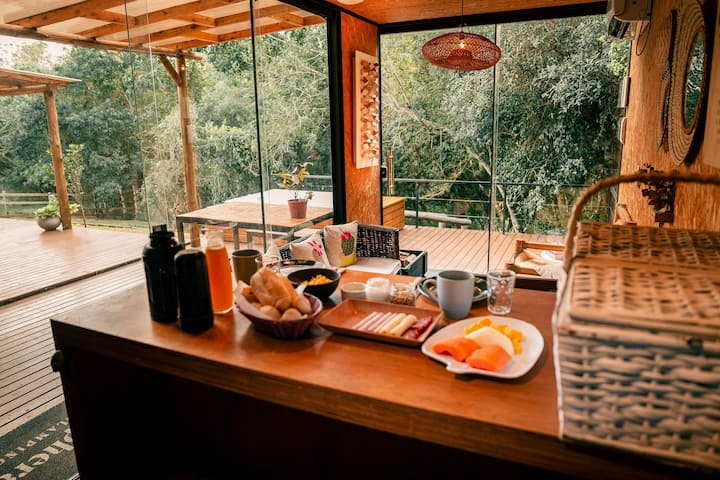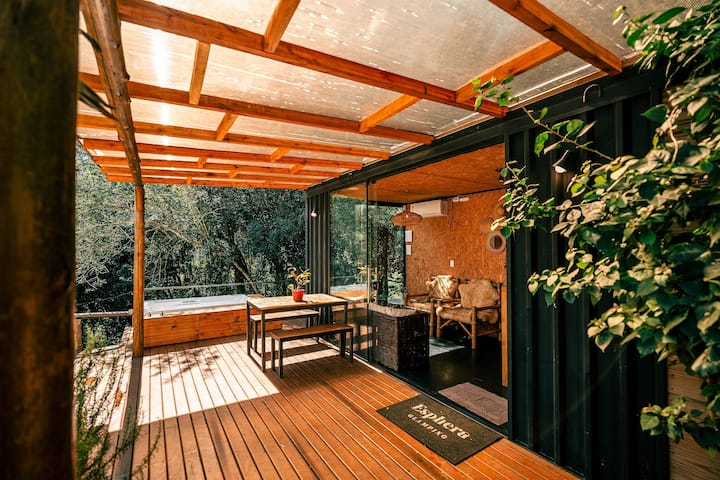Onze Esphera Água is geplaatst in het inheemse bos. De sfeer heeft lichtere tinten, decoratie met touw en macrame, en een individueel privébad met warm water in het inheemse bos om te ontspannen in totale harmonie met de natuur.