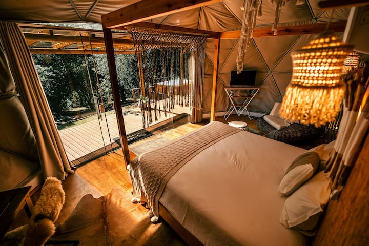 We zeiden dat het de ontmoeting was tussen glamour en kamperen, toch? Elke hut garandeert je comfort, veiligheid en welzijn. Alle accommodaties hebben badkuipen die harmonieus communiceren met de volledig exclusieve en privéomgeving.