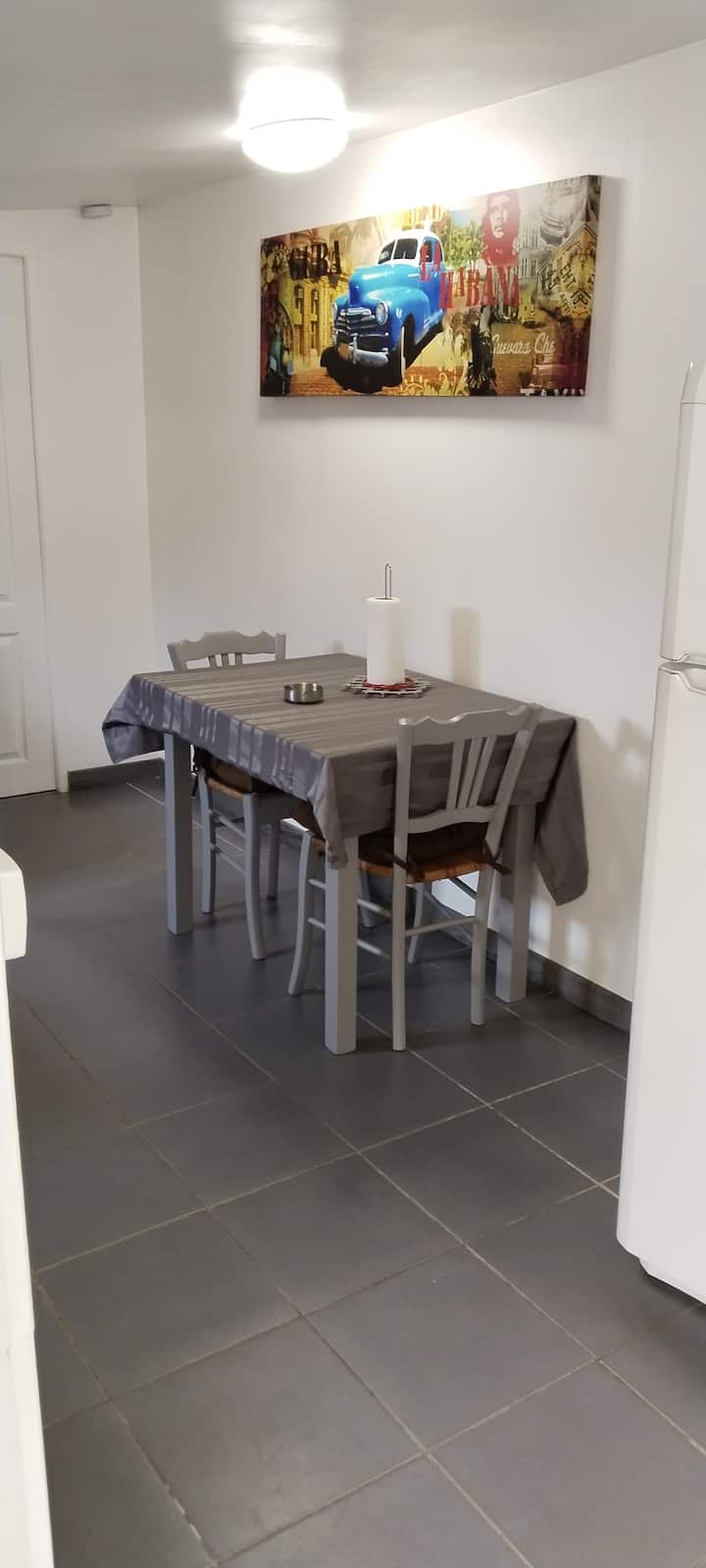 Woonkamer slaapbank, tafel en stoel, TV, WiFi