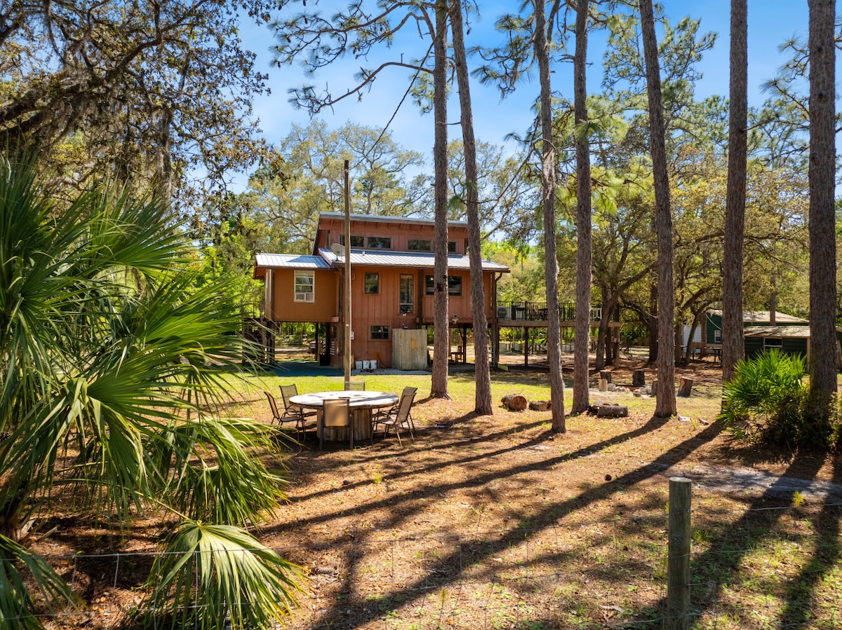Ons huisje met één slaapkamer ligt midden in meer dan 25 hectare van de prachtige Florida Nature Coast. Hoewel we afgelegen zijn, hebben we alle gemakken van thuis, van binnen sanitair en warm water tot airconditioning en wifi. Onze tv heeft een Firestick, dus neem je streamingaccounts mee en ontspan 's avonds nadat je bent gestopt met het roosteren van Smores op de buitenhaard. Een uitklapbare slaapbank brengt dit van een 2 persoons huisje naar 4 in slechts enkele minuten. Parkeren is geen probleem, zelfs niet als je een aanhangwagen hebt.