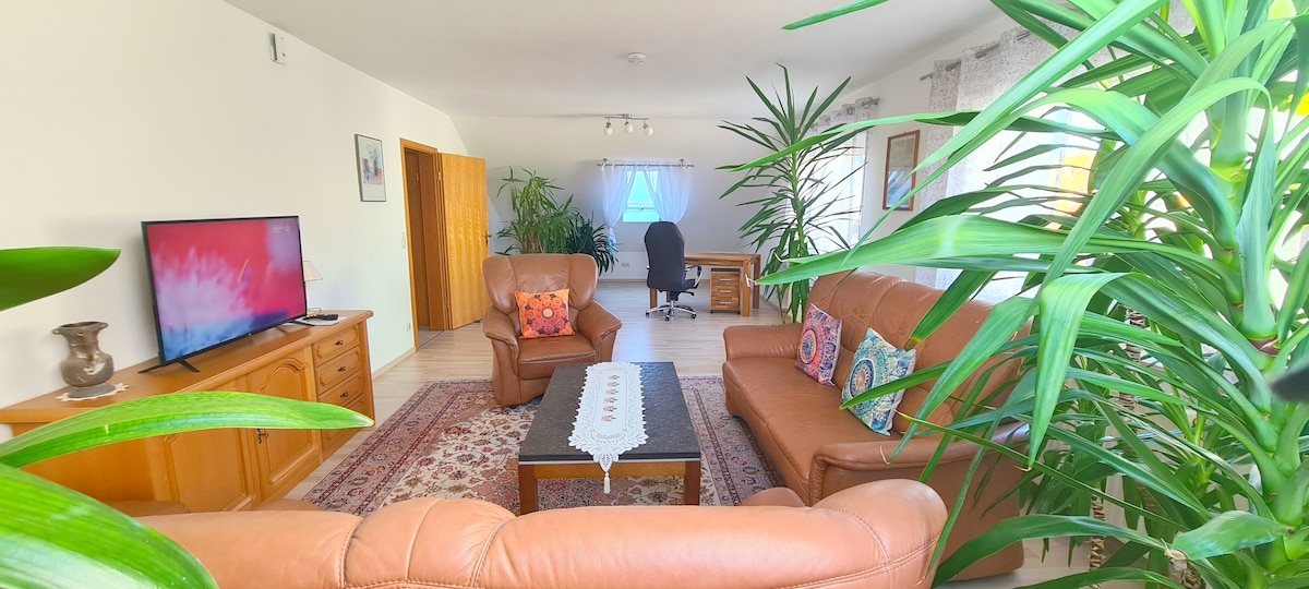Groot appartement voor maximaal 6 personen met 3 slaapkamers - rustig maar centraal gelegen tussen Forchheim/Bamberg en Erlangen/Neurenberg. Veel ruimte op ongeveer 120 vierkante meter. Optionele extra kosten plus 12 € voor elke extra gast van de 5e persoon (de 6e heeft een slaapbank op de zolder in de 'themakamer'). Parkeerplaats voor 2 auto 's Fietsen kunnen veilig worden geparkeerd in de schuur. Toegang tot wasmachine en droger in de kelder. Ruimte om te drogen op zolder