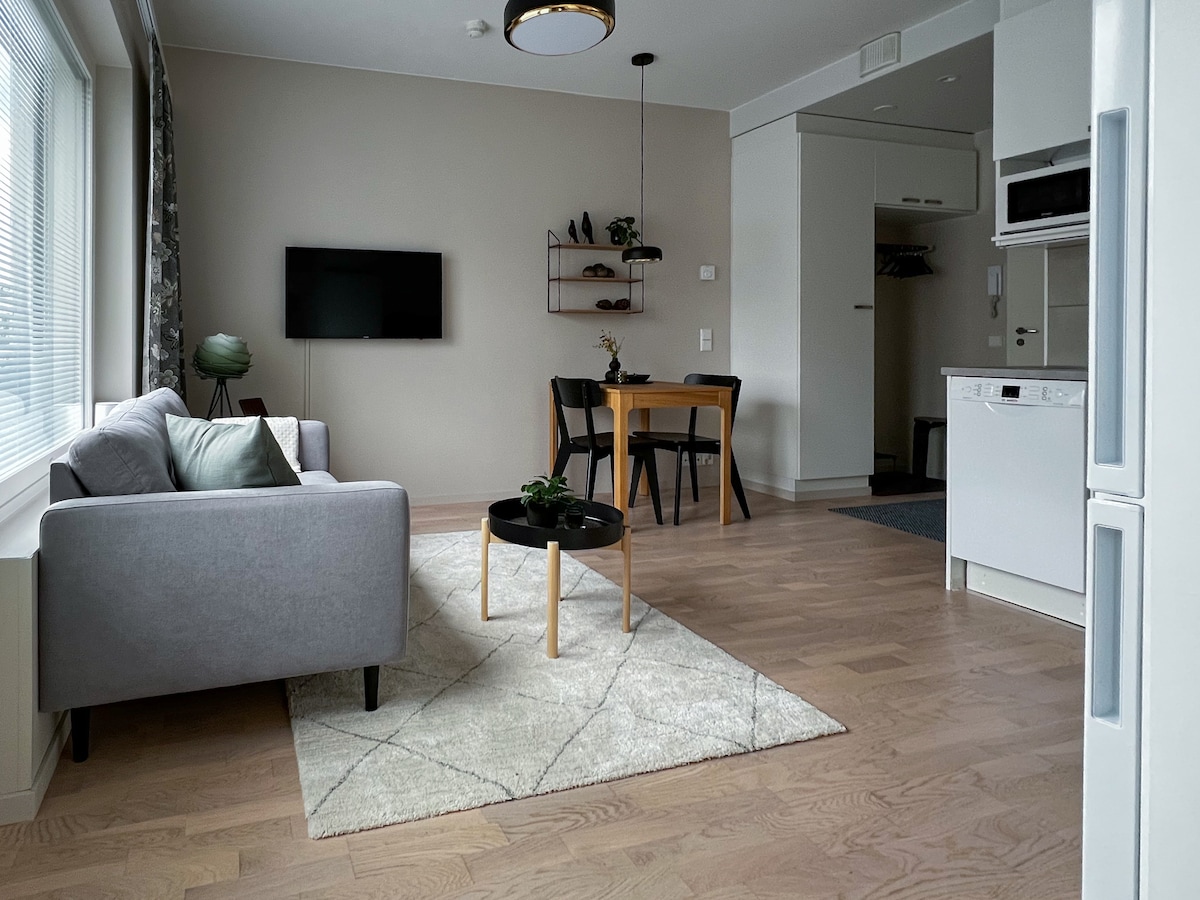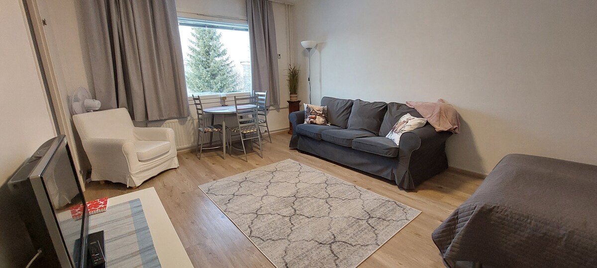* 44 m2 gerenoveerde woning met Scandinavisch interieur * Geweldige locatie in het stadscentrum * Alle moderne faciliteiten incl. originele Finse sauna * Veilig en kalm * Geschikt voor gezinnen, zakenreizen of 4 volwassenen - Veel openbare parkeerplaatsen vlak aan de deur - 2 minuten lopen naar bushalte - Gemakkelijk op te halen plek voor safarireizen