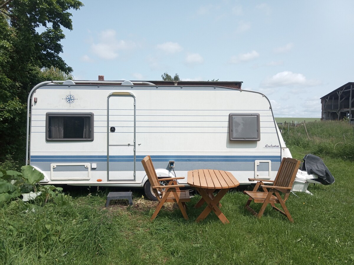 Caravan met tweepersoonsbed, op een weide bij een grote schuur. Je kunt een vuur maken en chillen. Toilet en douche in de schuur gedeeld met anderen. Koelkast, borden en potten. Een tafel met zithoek is aan de andere kant, maar je kunt het ook omzetten als een bed, onkruid en brandnetels zijn er ook:) hippi flair, mensen van over de hele wereld zijn van harte welkom. Mogelijk in oktober in de herfst met verwarming. Luifel is opgezet.