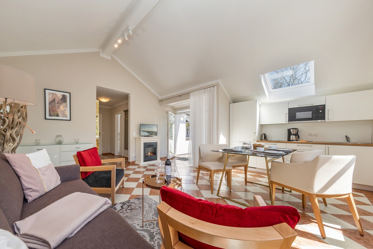 De karakteristieke deur van de villa biedt nu een adembenemende slaapkamer met een panoramisch uitzicht van 360 graden. Daarnaast biedt het penthouse nog een aparte slaapkamer en een slaapmogelijkheid op de slaapbank in de woonkamer. Strandstoel, mai-september, eerste zeelijn. 2-6 personen, zolderverdieping, slaapkamer met direct uitzicht op zee in de toren – met aparte toegang via een wenteltrap. Nog een aparte slaapkamer met een queensize bed. Volledig uitgeruste keuken, enz.