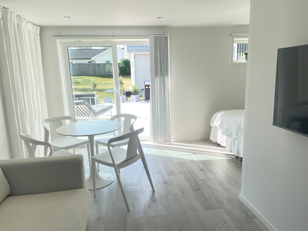 Unieke accommodatie in eigen huis met eigen tuin en patio,dichtstbijzijnde zwemplek op ongeveer 500 meter afstand. Het huis is 25 m ², evenals een slaapzolder van 10 m ². Heldere oppervlakken en betegelde badkamer met wasmachine. Keuken met inductiefornuis en koelkast en vriesvakje. Vloerverwarming in het hele huis,zorgt voor een soepele en goede verwarming. www.instagram.com/studiostyrso Moderne studio met licht interieur en een nieuwe keuken,centrale vloerverwarming voor de koude winterdagen. Compact wonen ten top.. Niet binnen/Niet roken in het huis.
