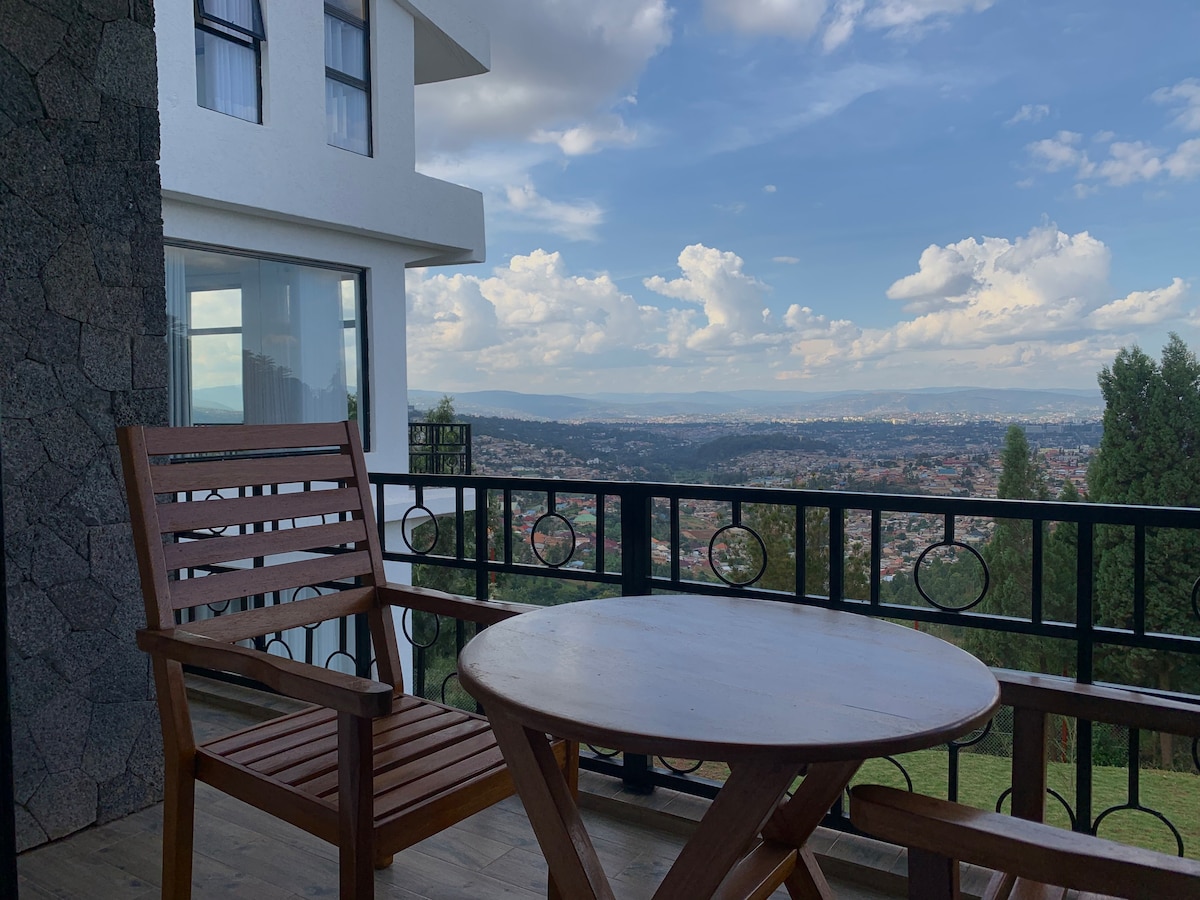 Ontspan vanaf jouw eigen terras en geniet van een prachtig uitzicht op Rwanda 's 1000hills en Virunga vulkanen. Het ligt op Mt. Rebero en biedt een rustig uitje van het bruisende stadsleven net onder de heuvel en ligt op slechts een paar stappen afstand van een bioscoop, speeltuin, minigolf en minifootbal. Het ligt naast een bos, de thuisbasis van de blauwe vervetapen en op hetzelfde terrein als ons huis (familie Rw-Be). Slechts 15 minuten rijden naar het centrum (Kiyovu) en Kigali Convention Center. Gezinsvriendelijk. Schoonmaak incl.