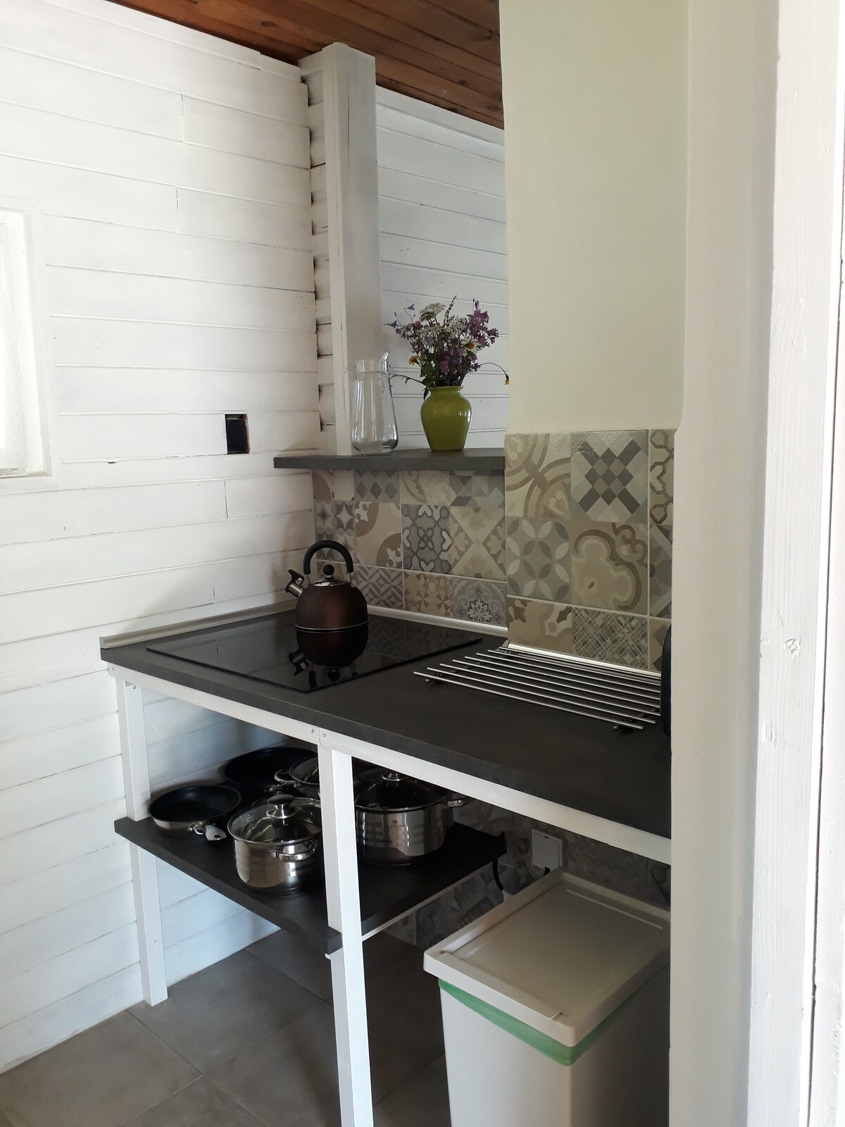 Hut nr. 3 is gemaakt om te ontspannen. Het is de enige met een eigen open haard en uitzicht op de beek. Zowel volwassenen als kinderen zullen genieten van het ruisen van de beek. Ik beveel het aan voor liefhebbers van afkoeling. Bij de hut is een steiger met een baai waar u kunt afkoelen. In de zomermaanden (of tot het vriest) is er een buitenbadkamer met een bad en warm water alleen voor u beschikbaar. Het huisje heeft oudere apparatuur, maar het heeft zijn eigen charme. Er is ook een hot tub, vuurplaats, trampoline, zandbak, grill voor iedereen.