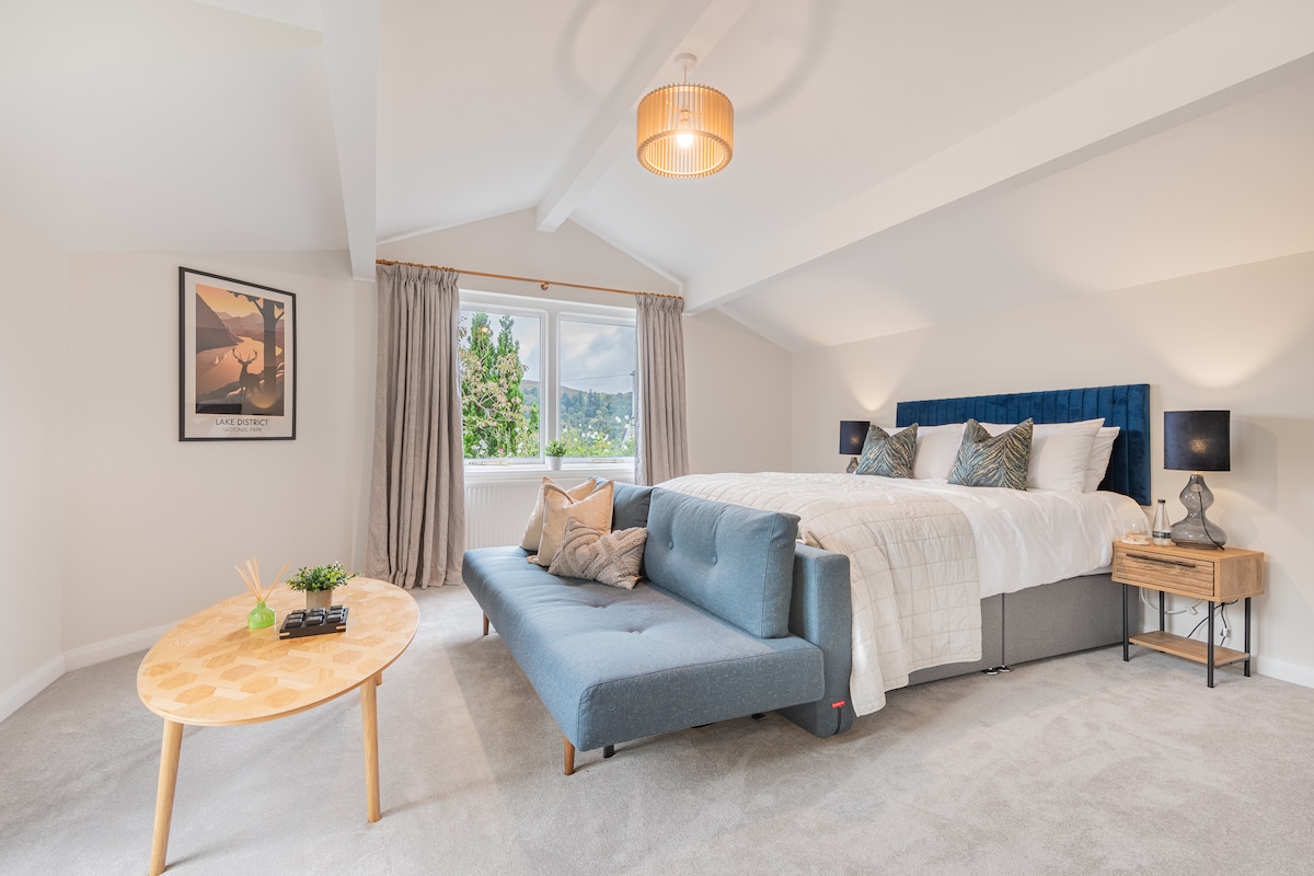 Bright, spacious, one floor living, renovated to a high standard. Modern furnishings, open plan layout, dining and 'island' area, separate utility, perfect for relaxing or socialising. The luxurious bedrooms all come with smart screen TV's , state of the art en-suites in two of the bedrooms and a family bathroom. Great outdoor space, views to Wansfell Pike. Driveway parking for two large cars or three small/medium cars. 5 minutes walk to Ambleside centre, shops and restaurants. No pets permitted