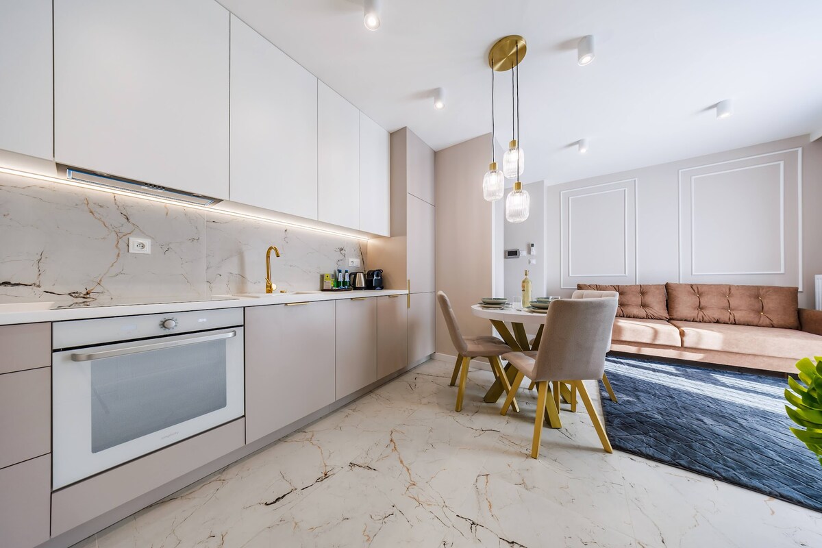 Luxe appartement met een oppervlakte van 45 m²: - Volledig uitgeruste keuken met eersteklas Gorenje- en Samsung-apparatuur. - Een woonkamer met een comfortabele bank, een moderne tv en een geweldig uitzicht op de stad. - Een prachtige badkamer met een bad en een douche. - Stijlvolle slaapkamer met een groot comfortabel bed.