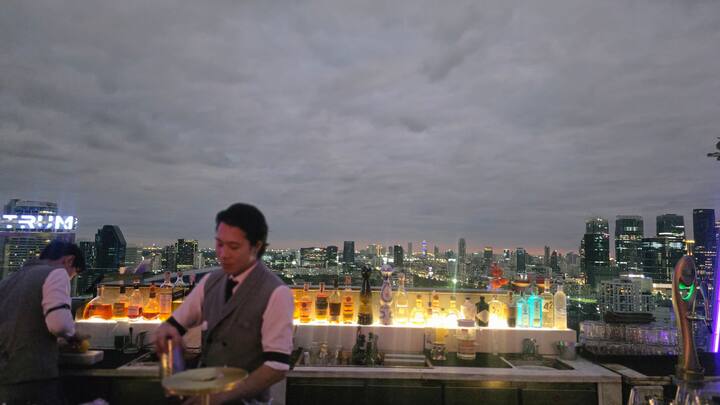 Zonsondergang in Bangkok: dak/straateten/verborgen bar
