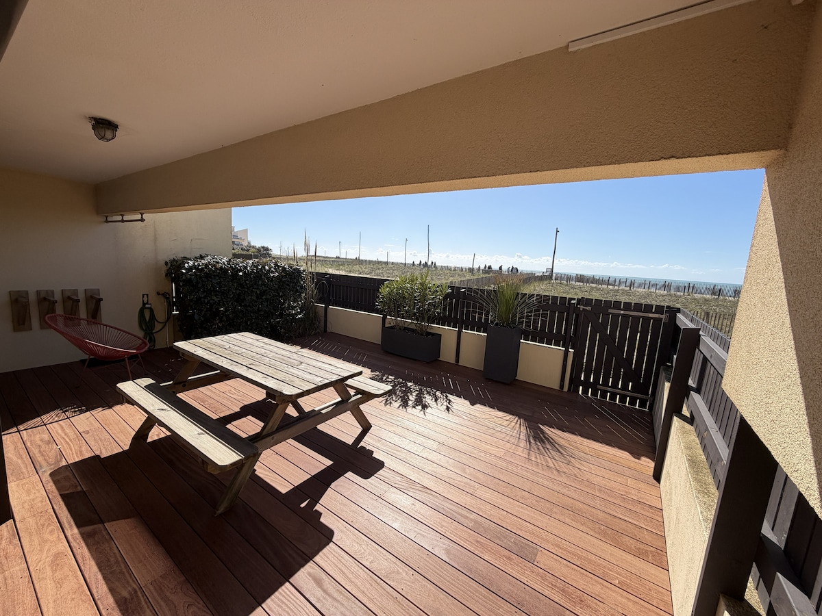 Résidence Océanide, venez découvrir ce pavillon T2 rénové de 38 m², de plain-pied, situé face à l'océan. Appréciez son confort (draps et serviettes de toilette fournis), ses équipements récents de qualité, et son patio cosy propice au farniente. Stationnez votre voiture (une place de parking sécurisée à disposition), et profitez selon vos envies, de la plage, des sessions de surf, des pistes cyclables, des commerces et restaurants, le tout accessible à pied.