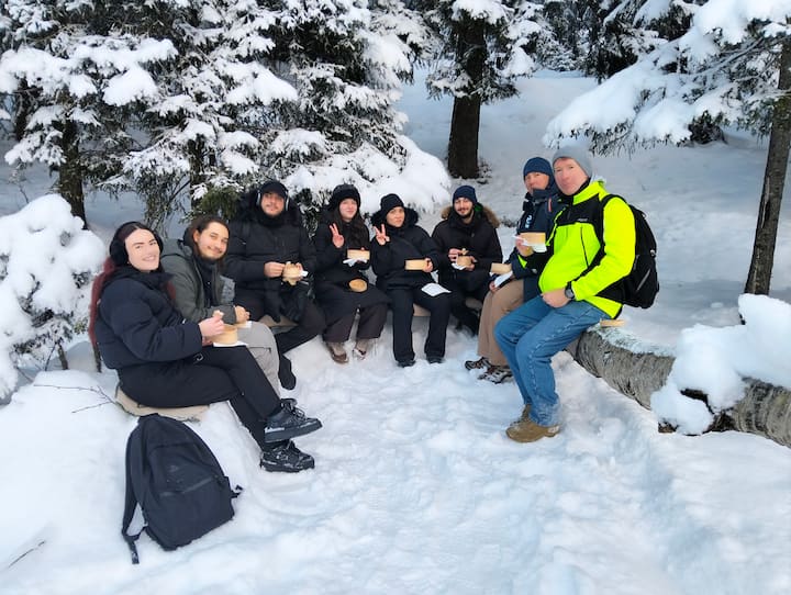 Winterwonderland boswandeling en kampvuur met hond