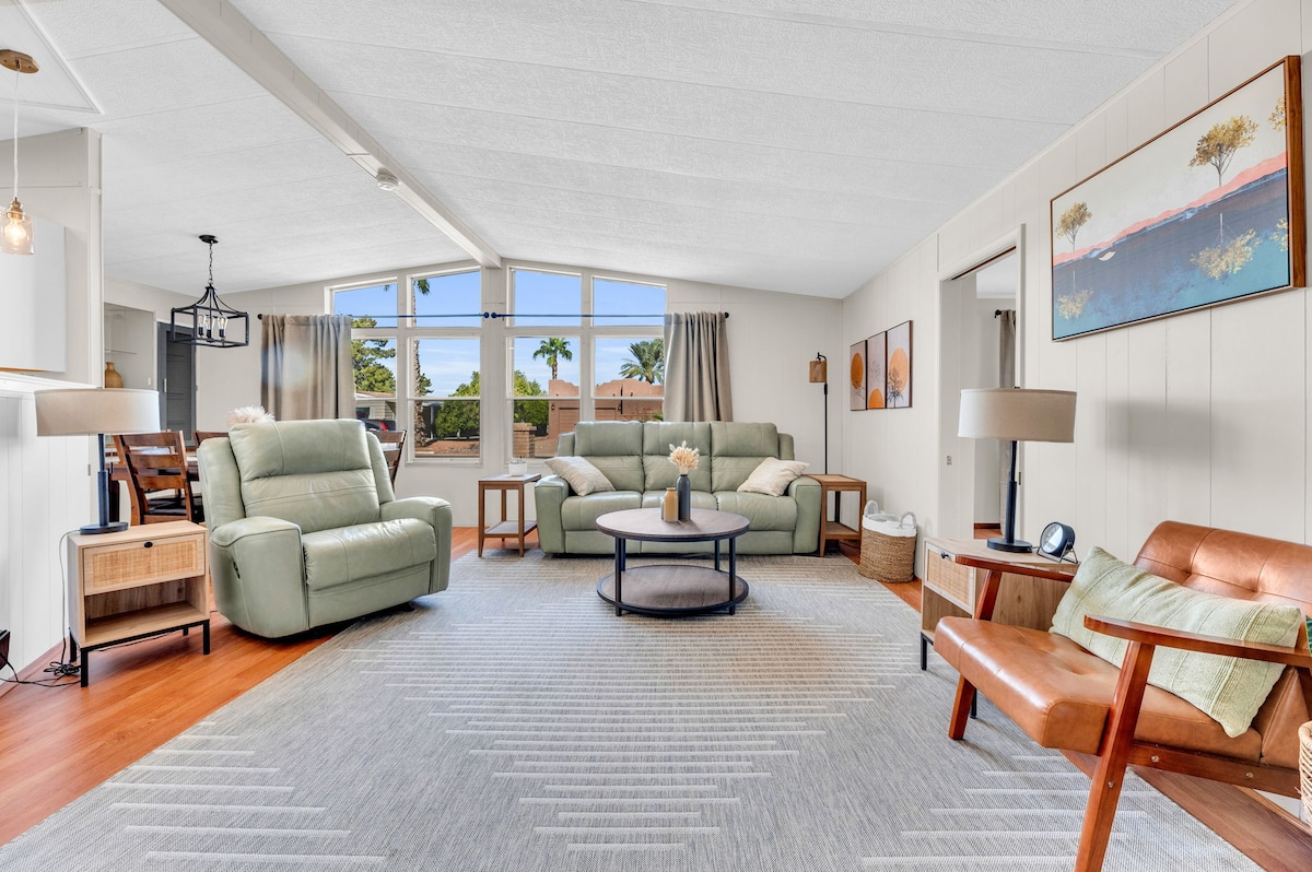 Welkom bij AZ GO RENTALS' nieuw gebouwde 2022 aangepaste woning - een ruime 1,500 vierkante voet gelijkvloers, 3BD/2BA retraite. Dit is een volledig apart gebouw, zeer modern huis met een garage voor 2 auto's en parkeergelegenheid voor 2 extra voertuigen, gelegen op een eigen terrein van 1 hectare achter het huis van de eigenaar. Je zult genieten van een strakke, open keuken, verfrissende douches, ultracomfortabele bedden en een vlekkeloze leefruimte. Gasten hebben ook toegang tot een pickleballbaan (vrijstelling vereist voor inchecken). Licentie: 21445829