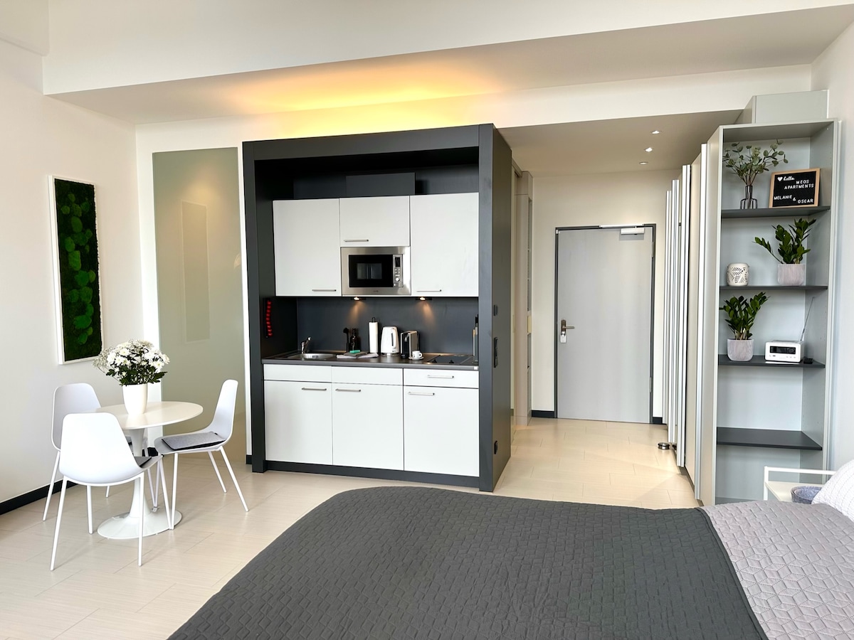 Uw studio bevindt zich naast een aantal anderen rondom een ruime loungeruimte. Hun volledig uitgeruste studio is de ideale plek om te rusten na een drukke dag. Naast de moderne badkamer is de studio met de volledig ingerichte keuken incl. Koffiezetapparaat en een werkruimte alles wat je nodig hebt voor je verblijf.