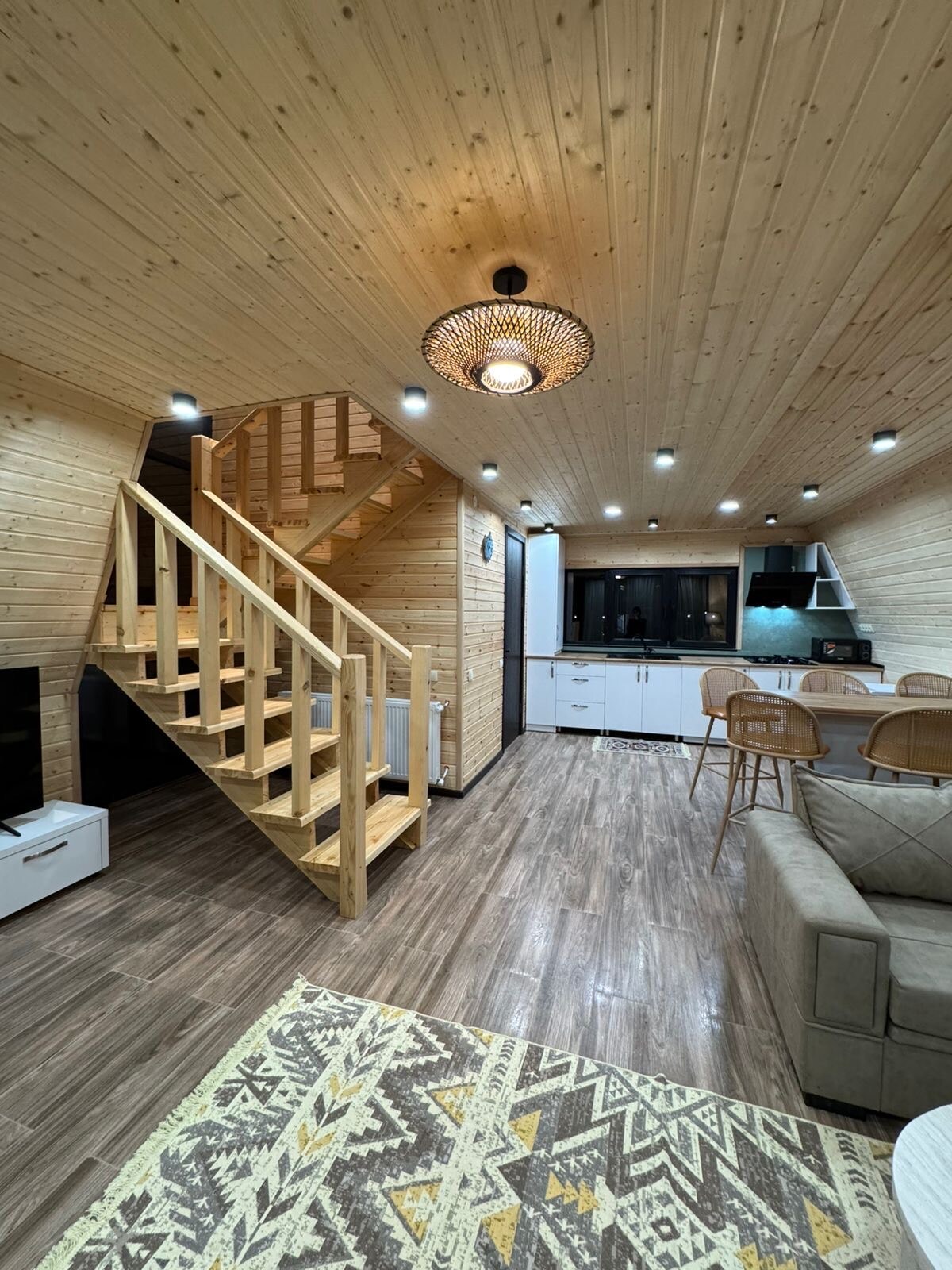 Our charming EcoCottage located in Borjomi is nested in a green landscape. The cottage is constructed from sustainable wood, giving it a natural appearance. Large windows allow for abundant sunlight, offering a perfect spot to relax. The interior of the cottage is a contrast to earthy surroundings. As you step inside, you’re greeted by a burst of warmth and color. These colours, which are complemented by wooden beams, create a total cozy atmosphere.
