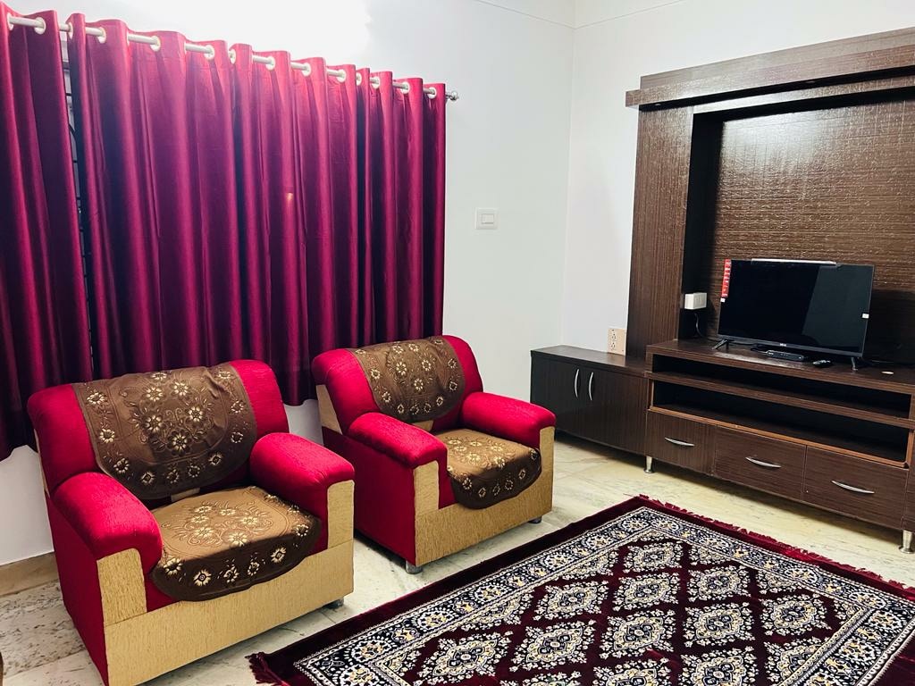 Welkom in mijn volledig ingerichte, comfortabele woning met 2 slaapkamers en 2 badkamers in North Bangalore, geschikt voor maximaal 6 personen. Elke slaapkamer is voorzien van een tweepersoonsbed en de woonkamer is voorzien van een slaapbank, led-tv, UPS-omvormer en Urban Ladder meubels. De keuken is uitgerust met een LG koelkast, broodrooster, inductiekookplaat en essentieel keukengerei. Het basistarief dekt twee gasten, met extra kosten voor meer gasten (maximaal zes). Deze gezellige en betaalbare Airbnb combineert comfort en eenvoud zonder luxe hotel extra's.
