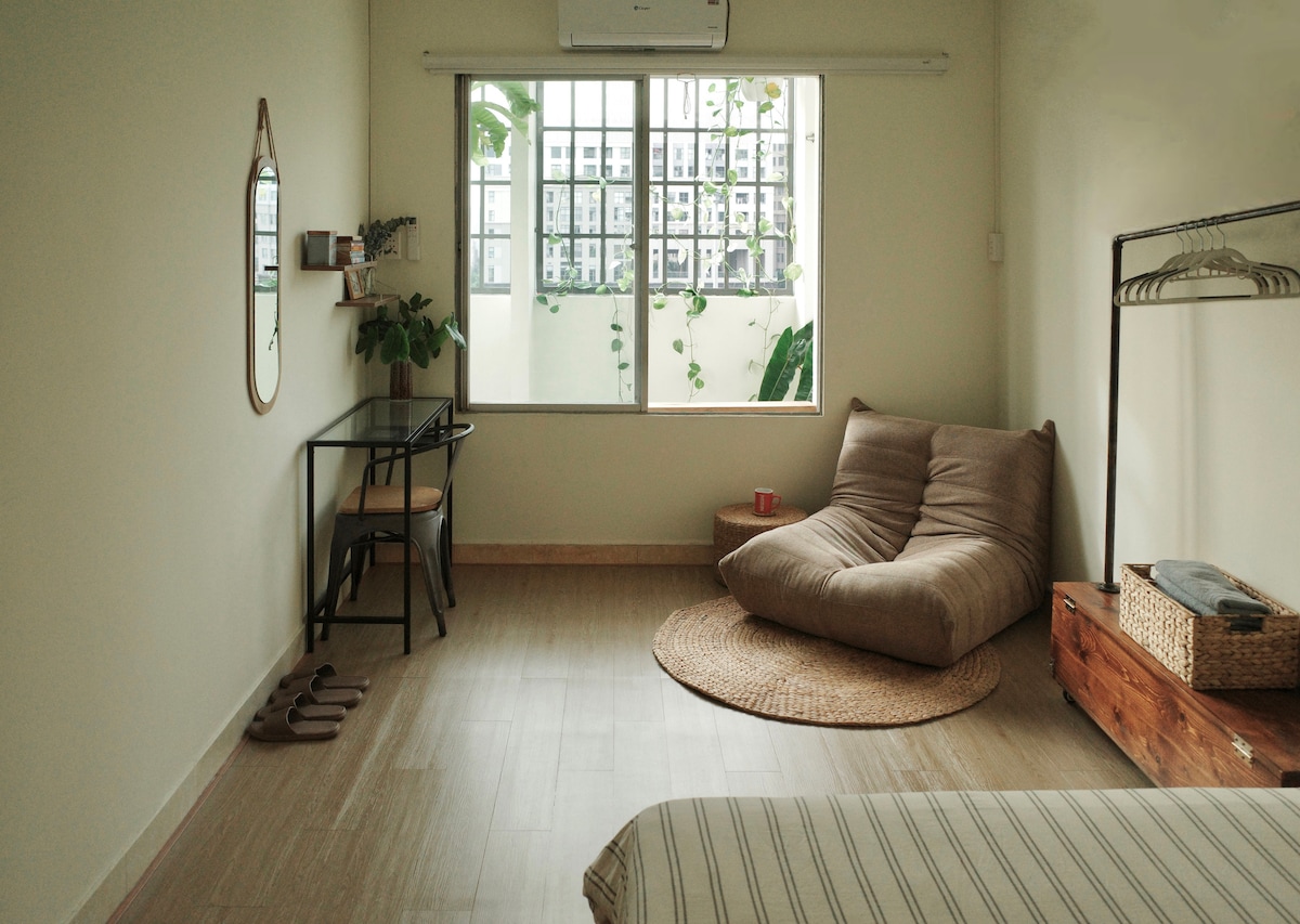 Room 101 là một căn studio tiện nghi nằm ở vị trí tuyệt vời, cách sân bay 3 phút di chuyển và cách trung tâm 10 phút. - Căn phòng được thiết kế với phong cách japandi với full ánh sáng tự nhiên, nội thất gỗ và được trang bị đầy đủ đồ dùng bếp đem lại cảm giác ấm áp như ở nhà - Nằm trên tầng trệt với cửa đi riêng, rất riêng tư và dễ dàng mang hành lý vào. - Phòng được trang bị máy chiếu hiện đại cài netflix giúp bạn dễ dàng xem những bộ phim hay như một rạp chiếu phim mini tại nhà.