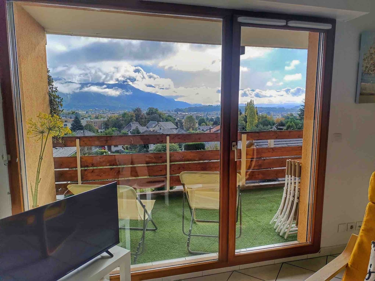 Dit rustige familiehuis ligt dicht bij alle voorzieningen: bussen, supermarkten (crossroads, white water (AB), decathlon, enz.) 10 minuten fietsen van het centrum, 20 minuten van Lac du Bourget. Het appartement is gelegen op de 2e verdieping van ons huis; het is een 3-kamer appartement van 80 m2 onder helling, met een keuken - woonkamer, 2 slaapkamers. Je hebt een sierlijke kleine badkamer met douche. Het terras heeft een prachtig uitzicht op de bergketen Belledonne. Eigen parkeerplaats op het terrein.
