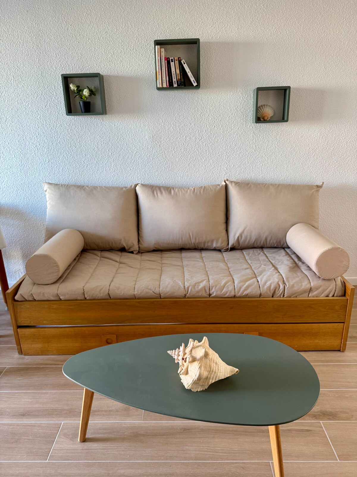 Appartement T2, volledig gerenoveerd , zeer licht, met prachtig terras met uitzicht op zee, in residentie met zwembad op 20 meter van de zee te voet - 1 aparte slaapkamer, beddengoed aanwezig, bed van 140 cm -SDB met bad, handdoeken aanwezig -WC - ingang met een kast - Volledig uitgeruste keuken (magnetron, koelkast/vriezer, oven, broodrooster, vaatwasser, wasmachine) - Woonkamer, bed, snelle bank 140 cm, TV, WiFi - Uitzicht op terras over zee en de bergen met tafel en stoelen.