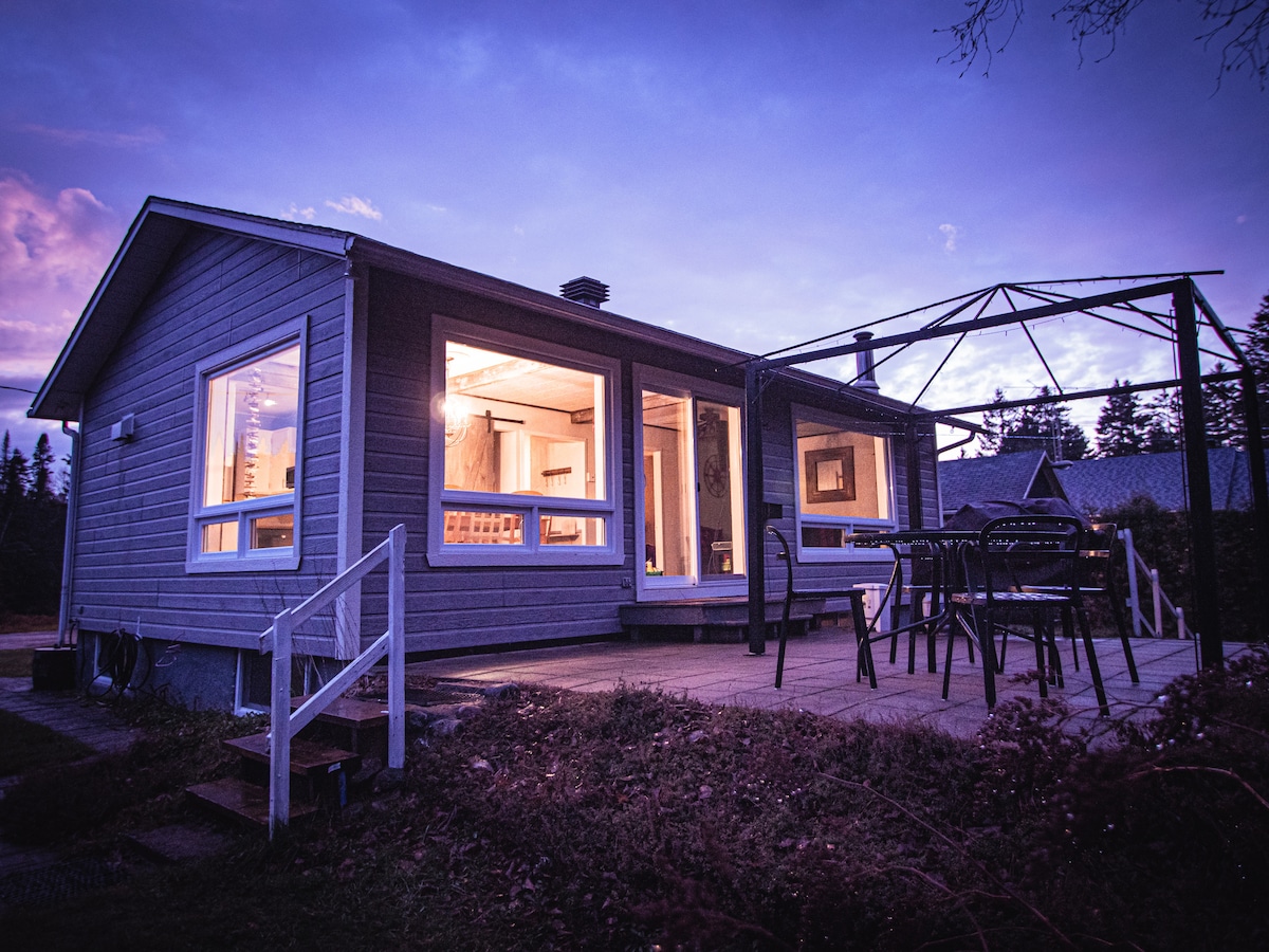 Le Perché-sur-la-rivière est un shack de charme en bois rond, circa 1962, tout restauré, plein sud. Littéralement perché sur l'eau. Véranda pour bains de soleil, repas, dodo. Arbres géants. 45 min de Montréal. Lumineux, paisible. Passerelle piétonnière et cycliste vers commerces, restos et boisé. Piste cyclable à la porte. Pour repos, télétravail, création, plein air. --BBQ sur place -- Randonnées et ski de fond dans les environs
