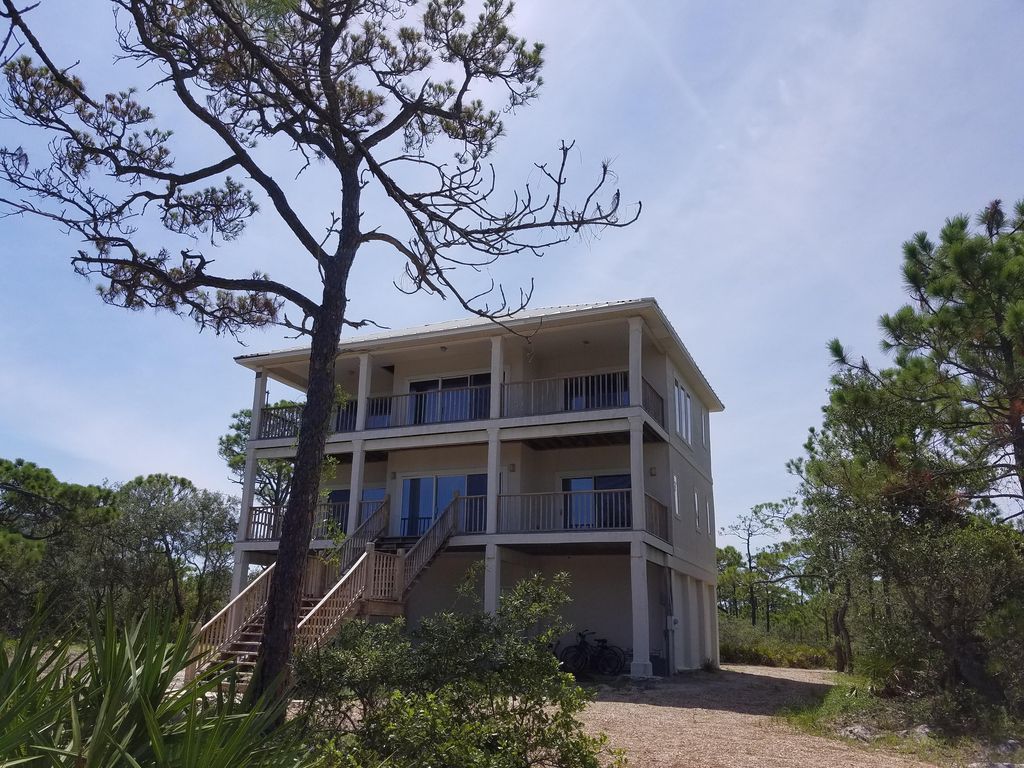A secluded 3-bedroom, 2-bathroom Gulf view home nestled in lush tropical vegetation. Just steps to the beach! Built in 2012, this charming home is in like-new condition. Open floor plan into living, dining and kitchen areas. Direct TV w/DVR, 4 HD Flat Screen TVs, Wi-Fi, charcoal grill and outdoor shower. Outdoor entertaining on two decks with patio furniture and picnic table. Close to restaurants, groceries, bicycle & kayak rentals, SGI State Park, Lighthouse, fishing pier etc.