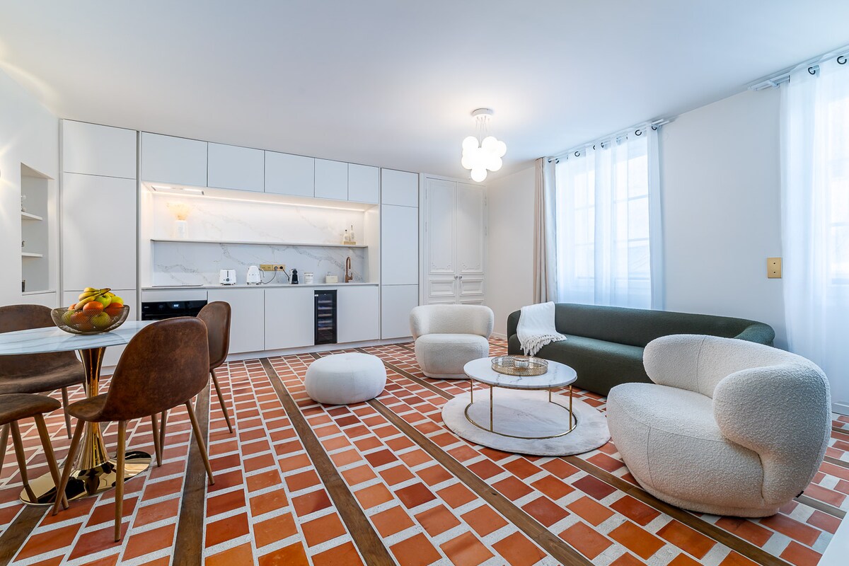 Verblijf in een rustig en licht penthouse, op slechts enkele stappen van het Louvre en Notre-Dame. Geniet van een gezellige sfeer met een open haard, piano en draaitafel, evenals een lichte keuken voor gezellige maaltijden. Ultrasnelle wifi, airconditioning en een speciale werkplek maken het een ideale plek voor reizigers, koppels, koppels met 1 kind, baby en thuiswerkers.