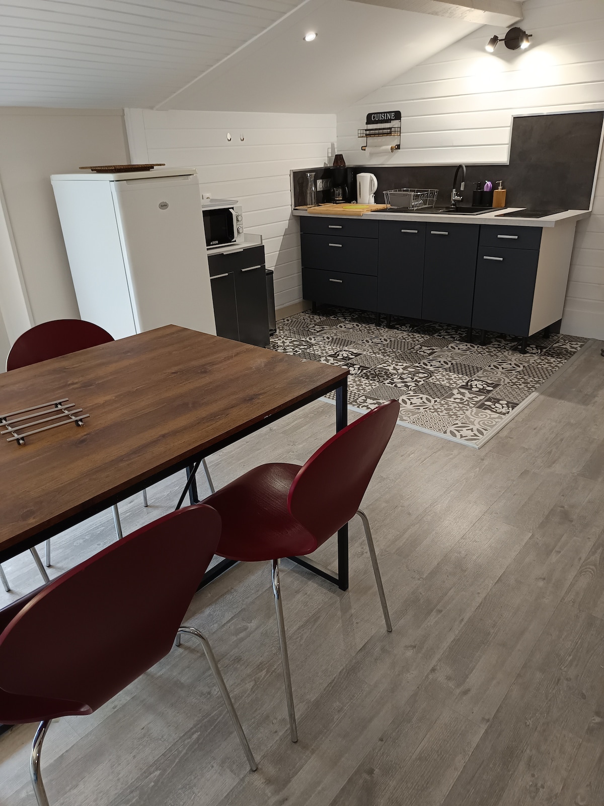 Studio in nieuw familiehuis op dezelfde verdieping. De accommodatie bestaat uit 3 aparte kamers voor een totale oppervlakte van 26 m². De slaapkamer met zit- / tv-ruimte en eethoek is 16m2, de doucheruimte is 6,5m2; tot slot maakt een kleine uitgeruste keuken van 3,5m2 het geheel compleet. Buiten is ontspanning verzekerd! Het terras is beschut door een pergola, met tafel, stoelen, tuinmeubilair, houtskoolbarbecue, gasplancha en een uitzicht op de familietuin.