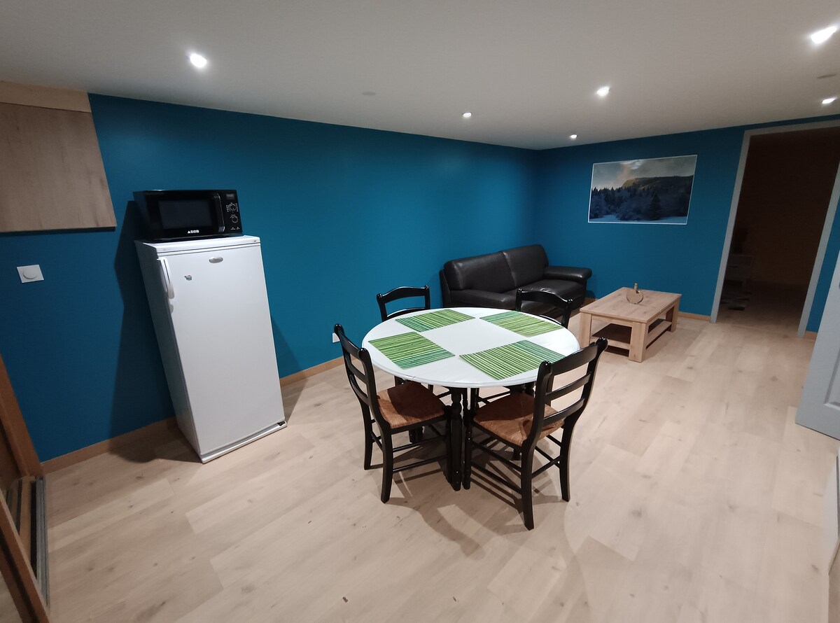 Een adembenemend panoramisch uitzicht op de bergen vanaf het balkon, een woonkamer met hout, hoge plafonds, een sfeer die uitnodigt tot ontspanning... Het balkon opent naar hellend land dat wordt begrensd door een beek, discreet afhankelijk van het seizoen met de discrete charme van de klarijnen op de achtergrond. Totale onderdompeling in de natuur. Intieme kamer, parkeergelegenheid, gemakkelijke toegang het hele seizoen, uitrustingsruimte. Beddengoed, handdoeken, tv, glasvezelinternet. Zelf inchecken. Geweldig voor een duo in sereniteit!