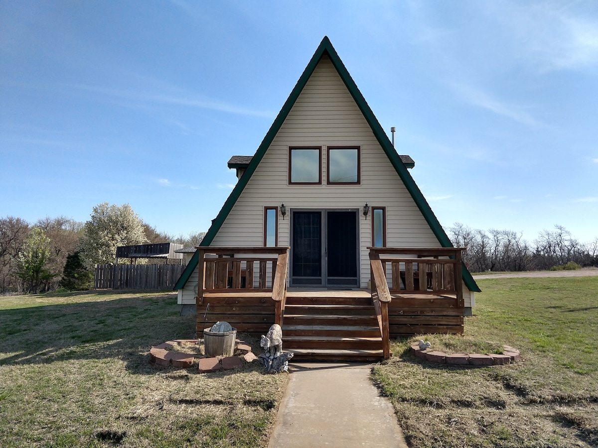 Het Sand Creek Ranch A-frame en Cabana is een bijgewerkt afgelegen huisje + aparte appartementssuite (cabana) op slechts acht kilometer van de stad, gelegen op een heuvel met uitzicht op natuurlijk prairiegras met bossen en beek erachter. De loft op de bovenverdieping herbergt de hoofdslaapkamer met queensize bed + complete badkamer, terwijl het hoofdniveau eronder een open indeling heeft (queensize bank en loveseat + complete badkamer) met dekken van alle ingangen (1e en 2e verdiepingen), waardoor het mogelijk is om wilde dieren te observeren en 's avonds naar de sterren te kijken.