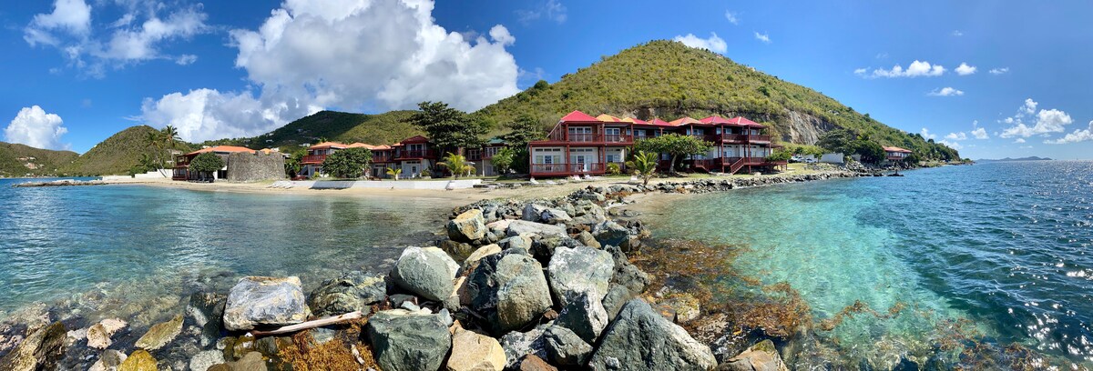 Welkom bij Sebastian's on the Beach, een boetiekhotel met uitzicht op het kristalblauwe water van Little Apple Bay, Tortola. Deze King Suite aan het strand biedt plaats aan 3 personen met een eigen badkamer, wifi en een minikoelkast, koffiezetapparaat en magnetron. Word wakker met het geluid van golven, breng de dag door op het strand en geniet van onvergetelijke zonsondergangen en dineren op het eiland op slechts een steenworp afstand!