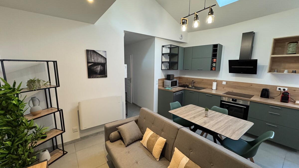 Charmante studio van 25m², volledig gerenoveerd. Met zijn zolderplafond en zichtbare balk straalt deze ruimte een warme en gastvrije sfeer uit. Twee kamerhoge ramen openen naar een rustige tuin met een zwembad, met een vrij uitzicht. Functioneel en comfortabel, het heeft een kitchenette, een goed aangelegde leefruimte en een moderne badkamer met ruime douche. Ideaal voor rustig verblijf. Je zult ook de helderheid en unieke charme van deze plek waarderen.