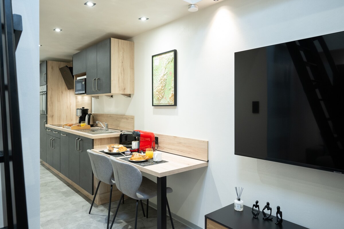 Onze nieuwe viersterrenstudio Le Saphir is gevestigd in een zorgvuldig gerenoveerd oud industrieel gebouw, op steenworp afstand van het centrum van Eloyes, winkels en vele wandelpaden. Volledig uitgeruste keuken, slaapkamer met 160x200 beddengoed en beddengoed van hotelkwaliteit, doucheruimte met hoogwaardige handdoeken, woonkamer met flatscreen-tv. Snelle WiFi. Omkeerbare airconditioning. Geniet van de warme en moderne sfeer voor een ontspannen verblijf.