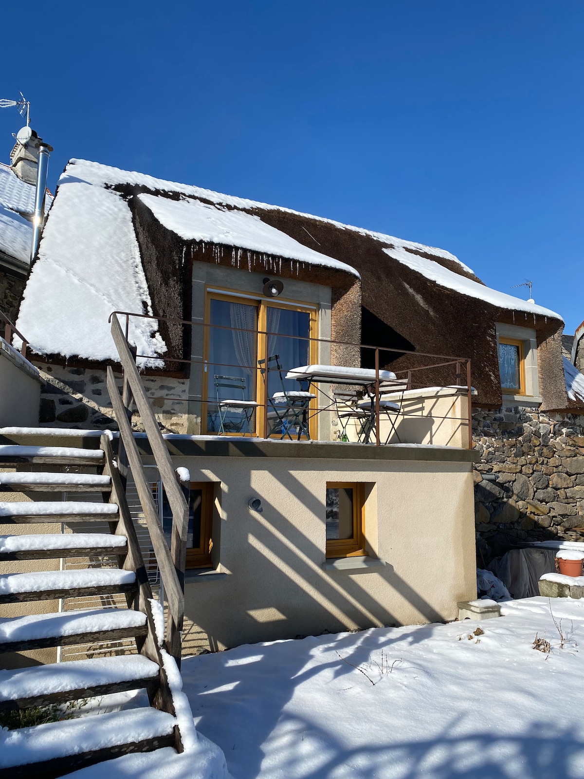 Gelegen op het platteland, op 4 kilometer van Condat en grenzend aan ons huis, staat onze Cantal-boerderij bekend als een longère. Dikke stenen muren, houten balken, grote woonkamer met traditionele open haard en houtkachel, internet-tv, twee slaapkamers, badkamer en ingerichte keuken. Geniet van het zitten bij een brandend houtvuur in de winter of in de schaduw van de oude limoenboom met een glas wijn en geniet in de zomer van het spectaculaire uitzicht. Wat de tijd van het jaar ook is, je zult genieten van het comfort en de charme van de Longère.