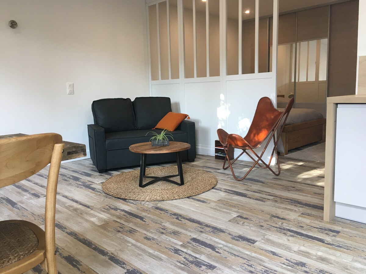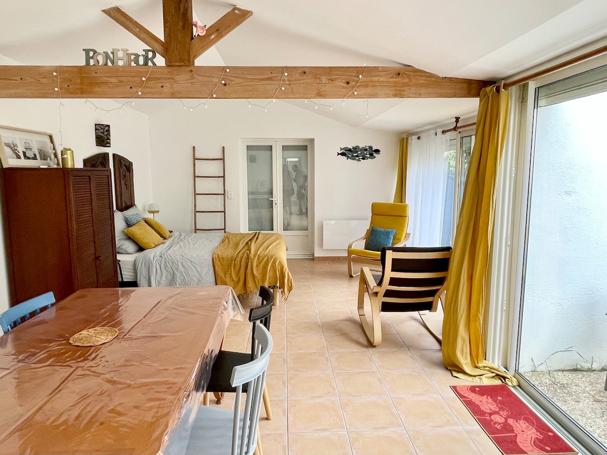 Charmant, eenvoudig, comfortabel, in 20 m2 onafhankelijkheid. Voor globetrotters: koffiezetapparaat, waterkoker, broodrooster, magnetron, plancha, koelkast, borden. Geen fornuis of oven. Klein houten terras met uitzicht op de tuin. En stilte. Rustig dorp, met nabijgelegen velden, fietspad, bos, zandstrand, zonsondergangen... Op ongeveer 2 km afstand, het dorp, alle winkels en iets verder, vissershaven, restaurants, markten en vele activiteiten. En dan op 700 m, de oceaan.