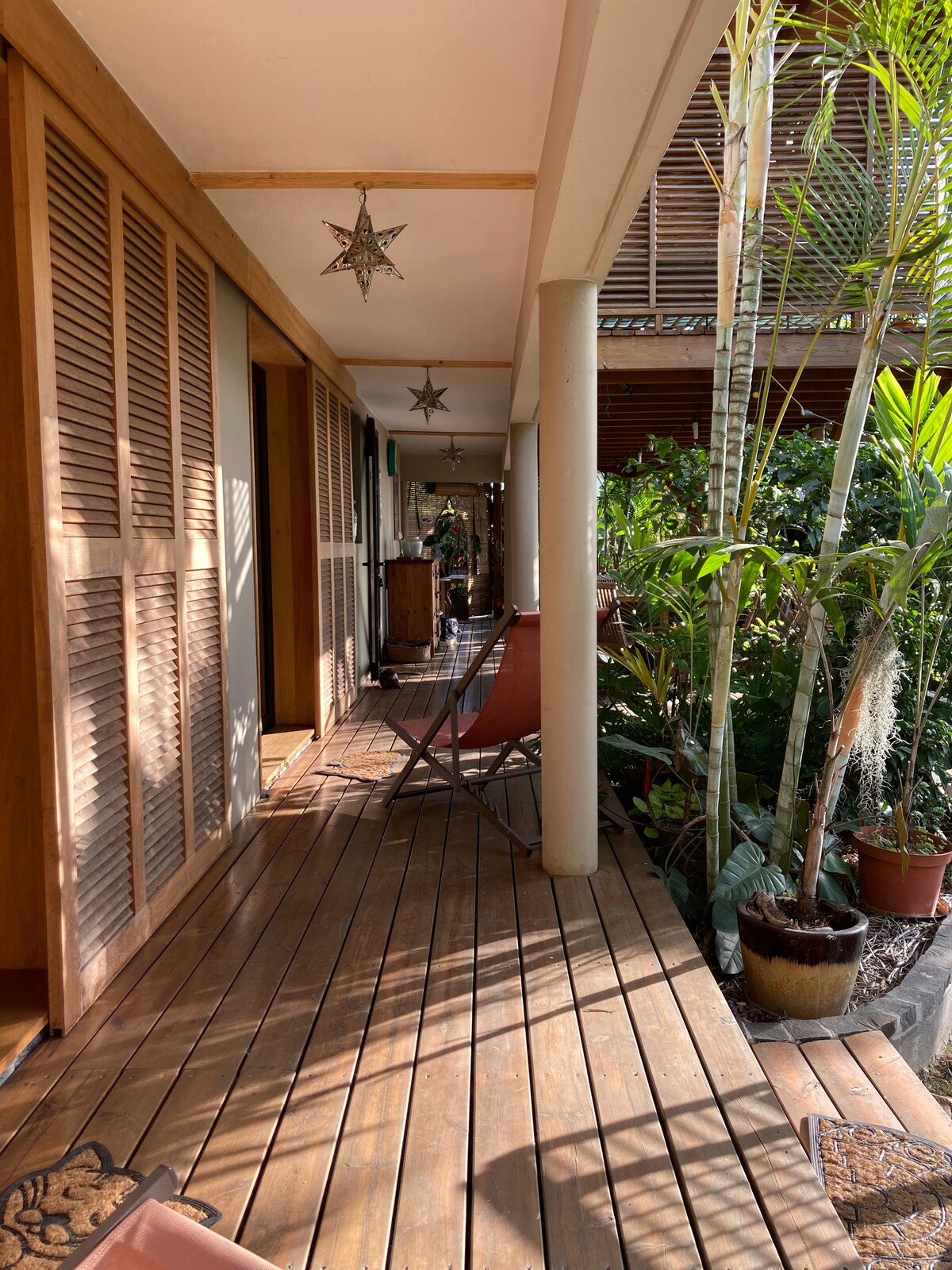 Mezzanine studio duplex met airconditioning 2/3 pers met toegang tot een gedeeld zwembad geopend van 10.00 tot 18.00 uur groot kathedraalplafond met een plafondventilator met afstandsbediening 1 groot bed 2 pers.queen grootte gescheiden van een trap voor het 2 e bed 1 pers fan /fiber wifi Uitzicht op de tuin met 2 eetruimtes, waaronder 1 buitenveranda met uitzicht op de exotische tuin Eigen badkamer/toilet,kast ,tv ,keuken 1 gratis parkeerplaats voor je ingang met automatische poort